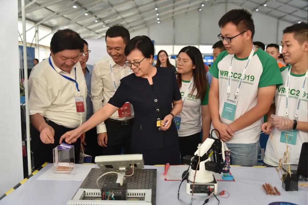 隨后,在 2019 世界機器人大賽機器人工業設計大賽冠軍挑戰賽的現場,魯昕會長向學生們詳細了解了 RFID 外殼定制及視覺檢測封裝流水線、超市智能散裝稱重系統、糖畫 DIY 機器人、智能涂膠機器人、基于磁阻變化的鐵氧體磁環表面缺陷無損檢測系統等工業機器人的設計思路與商業價值,并親自投票最具商業價值獎、最佳藝術獎、最佳創意獎的作品,鼓勵各院校師生們繼續努力。