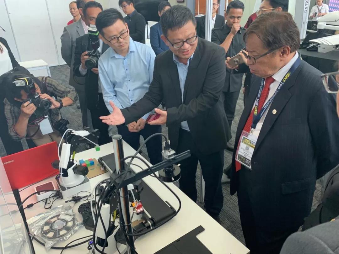 7 月 9 日,馬來西亞沙撈越國際數字經濟會議( IDECS )的展位上來自越疆的 Dobot 機械臂吸引了馬來西亞砂拉越首席部長 Datuk Patinggi Abang Johari Openg 一行前來參觀,工作人員對 Dobot 機械臂的功能應用、教育方案等做了詳細介紹。