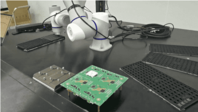 人工檢查可能會(huì)損壞芯片,而且效率通常較低。傳統(tǒng)自動(dòng)化缺乏靈活性,難以滿足小批量、多樣化生產(chǎn)的需求。協(xié)作機(jī)器人可以配備吸盤,從托盤中拾取芯片,進(jìn)行二次定位,然后將其插入印刷電路板測(cè)試板進(jìn)行質(zhì)量檢查。測(cè)試后,機(jī)器人把芯片整理到成品托盤中,降低了人為接觸損壞的風(fēng)險(xiǎn),提高了檢查效率。