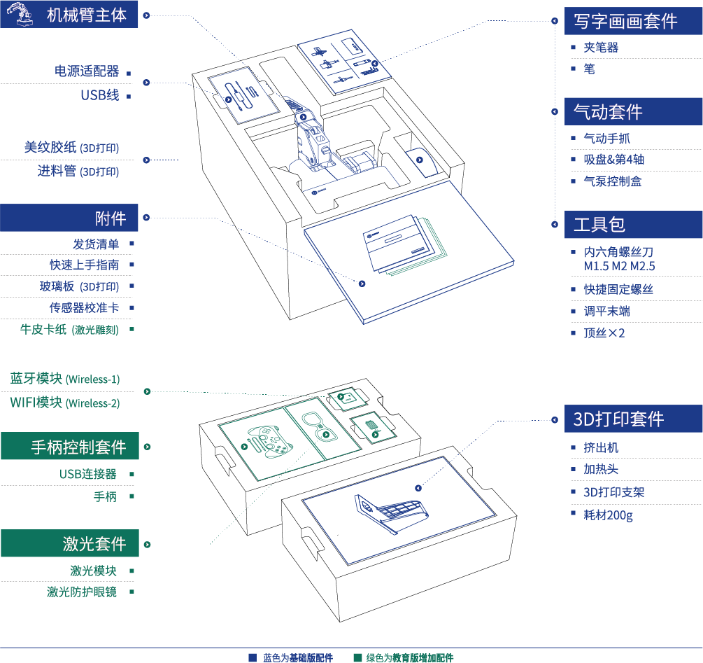基礎版本套件有機械臂本體、吸盤、手爪。 教育版本在基礎版的基礎之上...
